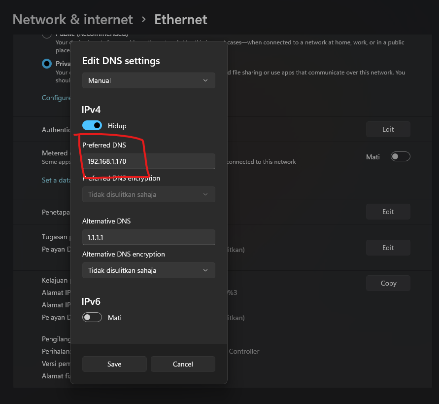 Setting > Network & internetdan masukkan alamat IP VM1 - DNS.